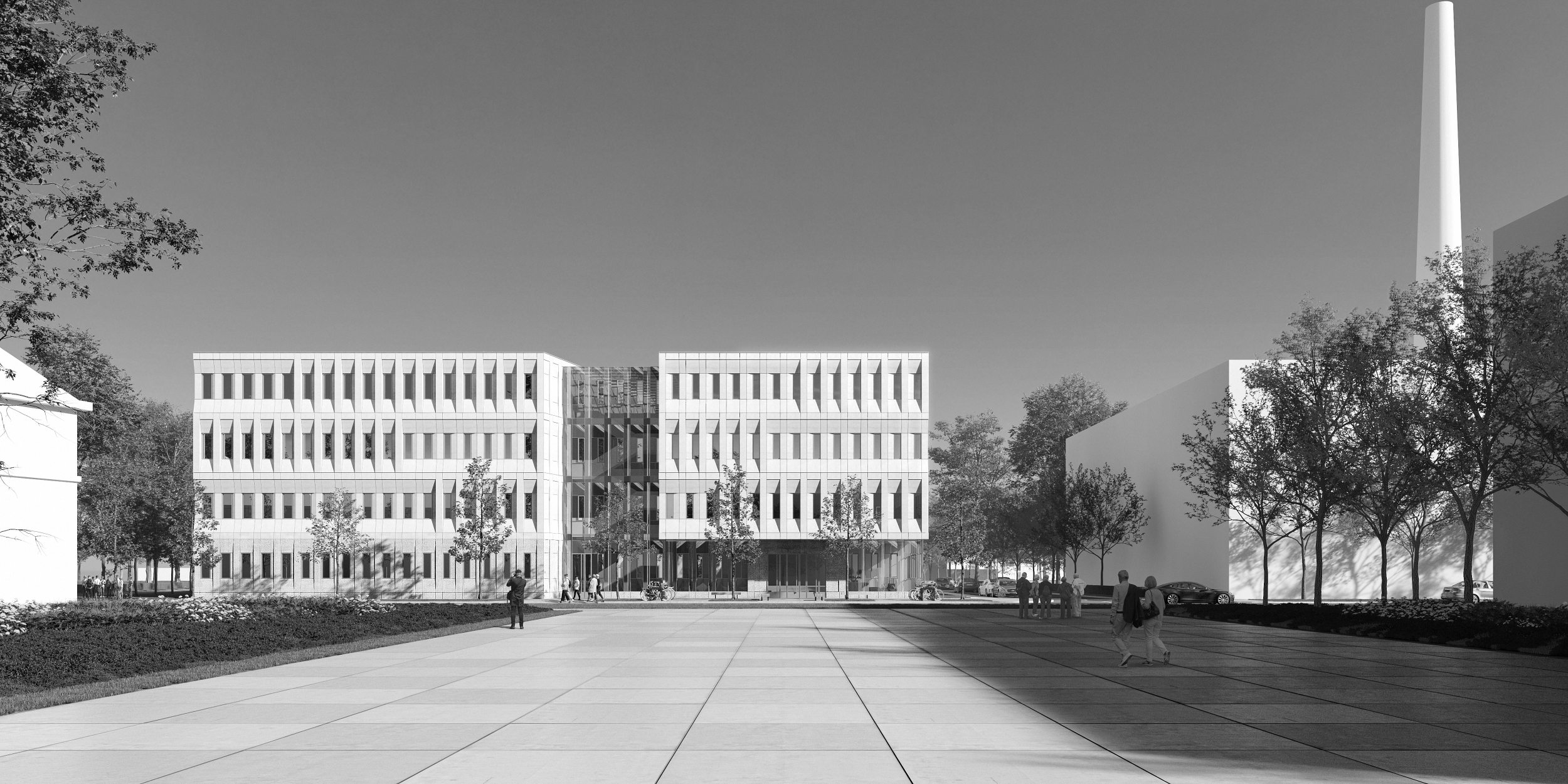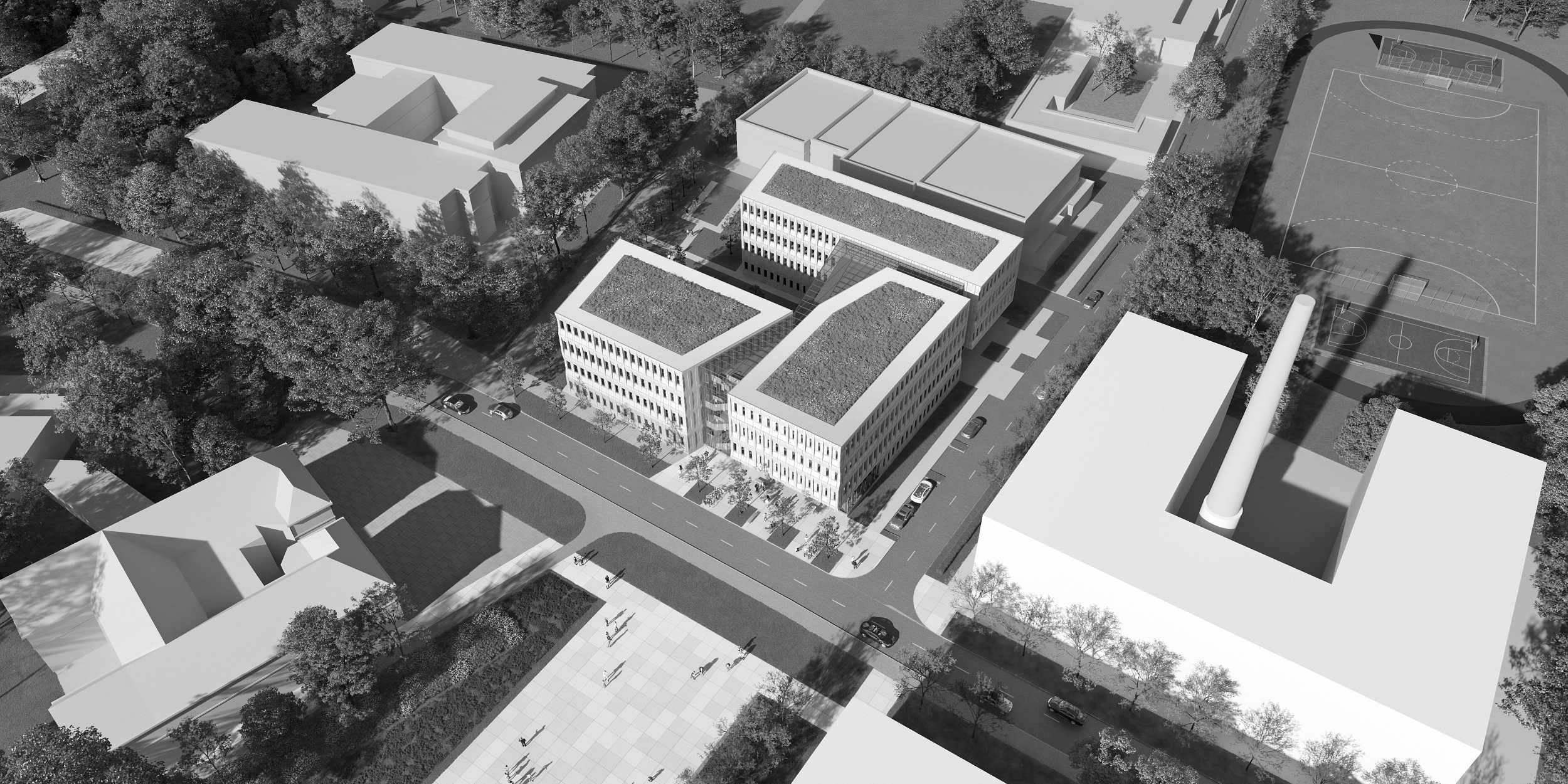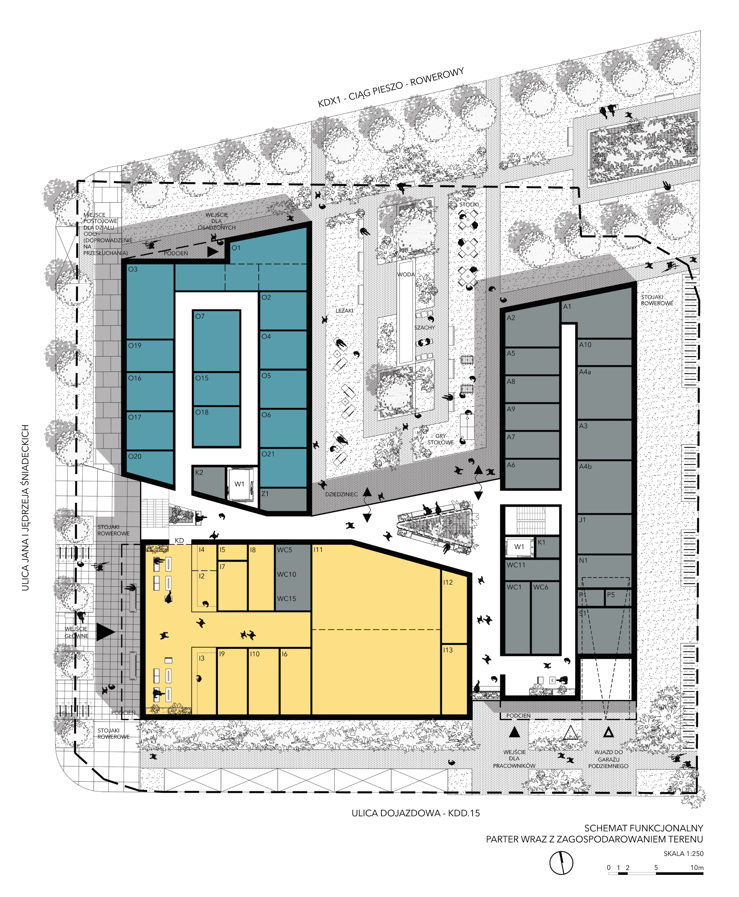 Zostało to osiągnięte poprzez przerwanie bryły budynku w linii wyznaczonej przez obiekt tworzący północną pierzeję Placu (budynek ujęty w GEZ). Kolejnym nawiązaniem do przestrzeni Placu jest umiejscowienie głównego wejścia na zbliżonej osi placu oraz dodatkowe zaakcentowanie tego miejsca poprzez wysunięcie bryły nad strefą wejściową. Zastosowane rozwiązania porządkują i nadają czytelny kierunek przestrzeni Placu, która ze względu na istniejące uwarunkowania, mimo zapisów MPZP, mogłaby mieć charakter przypadkowy.