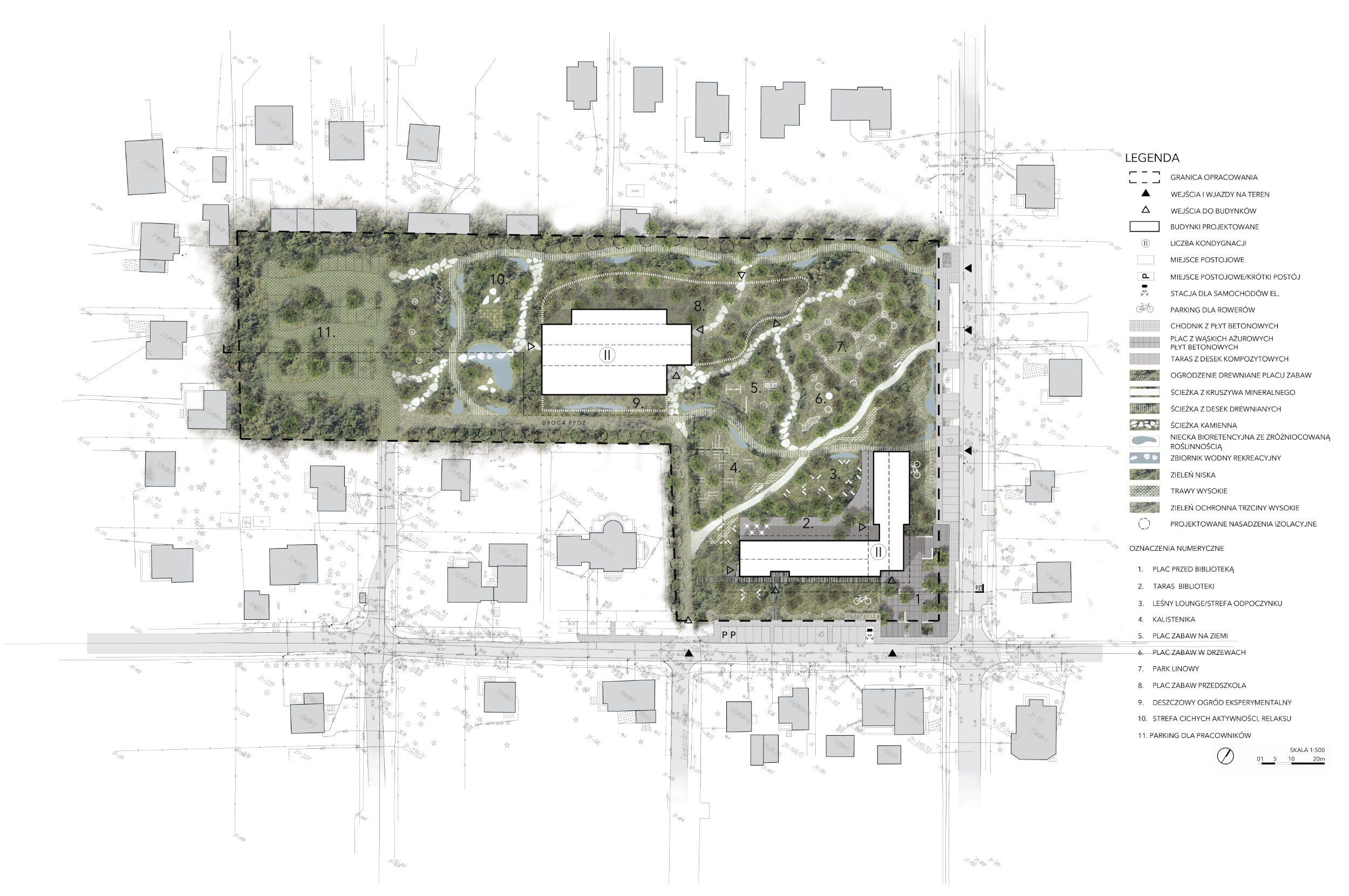 Projekt opracowany w ramach konkursu na koncepcje architektoniczną budynku biblioteki i przedszkola przy ul. Asnyka w Józefowie, organizowanego przez Miasto Józefów. Koncepcja pracowni zakłada zaprojektowanie dwóch osobnych budynków – przedszkola i biblioteki – co uznano za rozwiązanie korzystniejsze niż łączenie tych funkcji. Umożliwia to lepsze wykorzystanie terenu, równomierne rozłożenie zabudowy i ograniczenie ingerencji w istniejący drzewostan. Dwa wytypowane miejsca zabudowy pozwalają na minimalne naruszenie zieleni, a kształt brył dostosowano do uwarunkowań przyrodniczych, m.in. poprzez uskoki i rozrzeźbienie form.