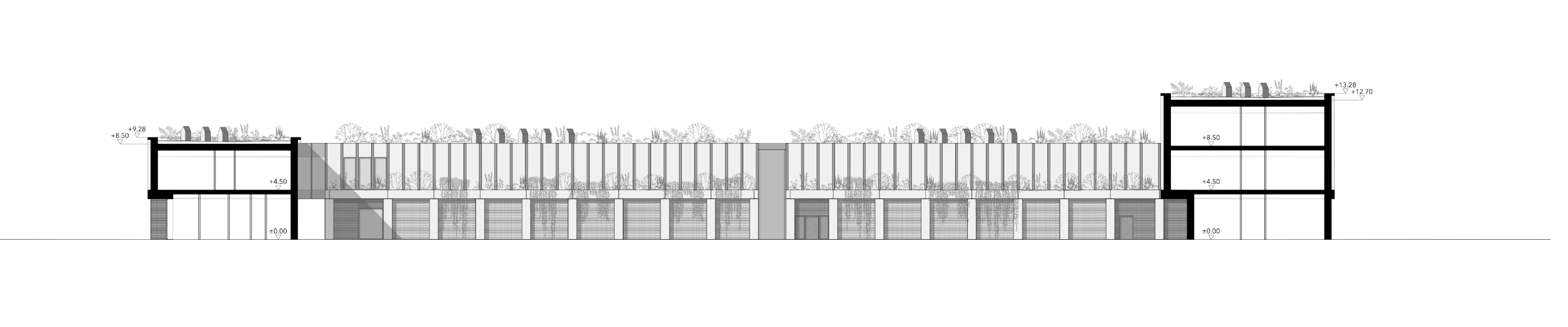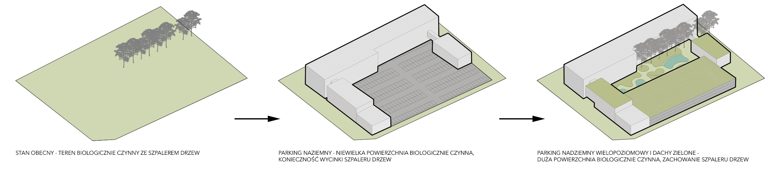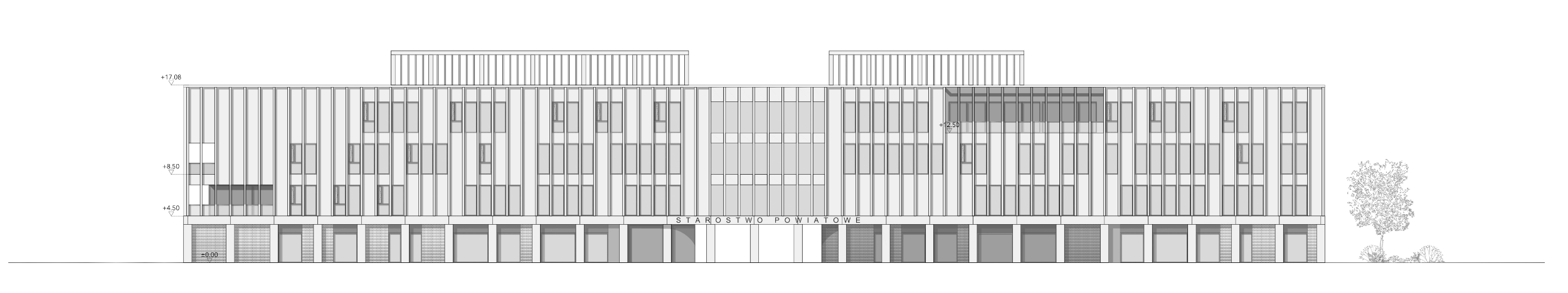 Silnym założeniem wyjściowym w kontekście tworzenia architektury proekologicznej było zachowanie charakterystycznego szpaleru drzew istniejących. Kompozycja przestrzenna budynku Starostwa opiera się na stworzeniu ogólnodostępnego zielonego patio w środku założenia. Główna oś budynku wprowadza użytkowników na wewnętrzny dziedziniec, gdzie umieszczono akcent w postaci spływającej po fasadzie garażu kaskadowej fontanny. Poprowadzone miękkimi liniami pola zróżnicowanej wysokościowo i gatunkowo zieleni dziedzińca stanowią kontrapunkt do rygoru rytmu i kolorystyki architektury. Przedpole projektowanego budynku ma charakter bardziej uporządkowany i reprezentacyjny.