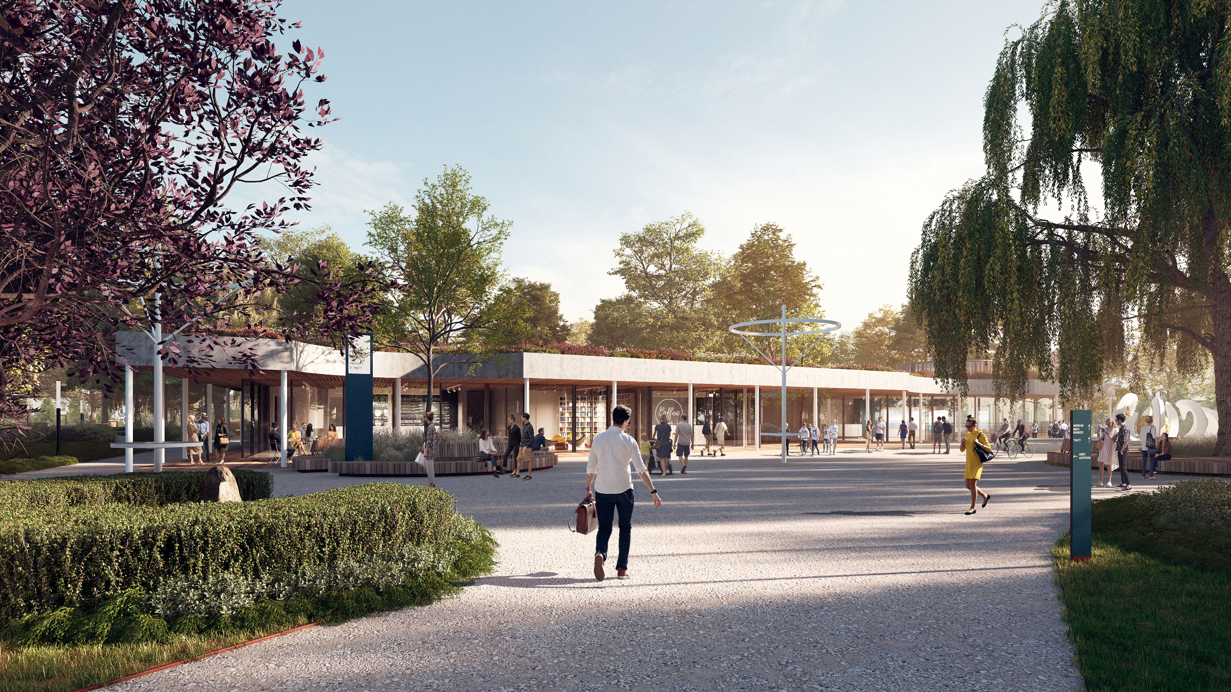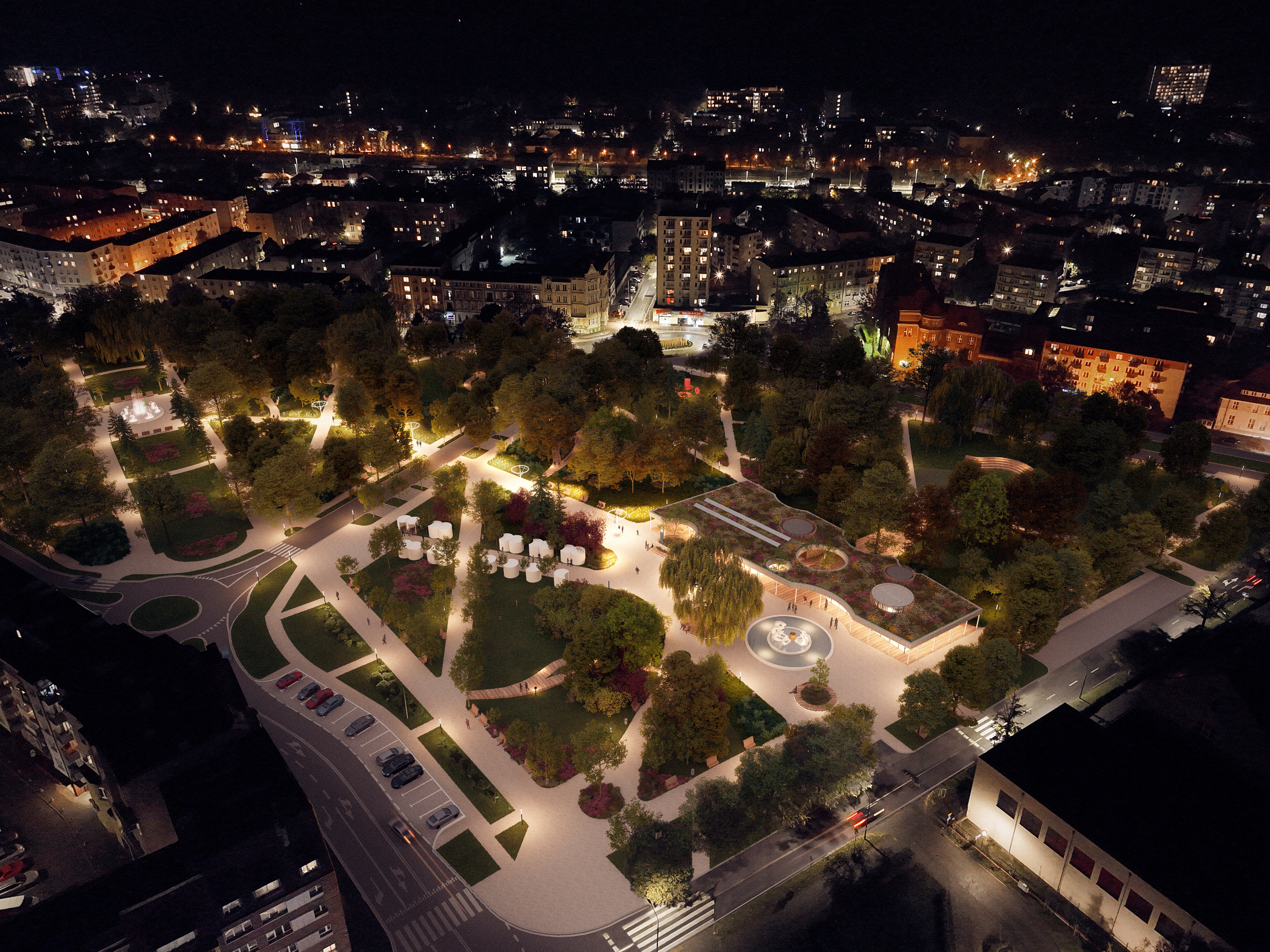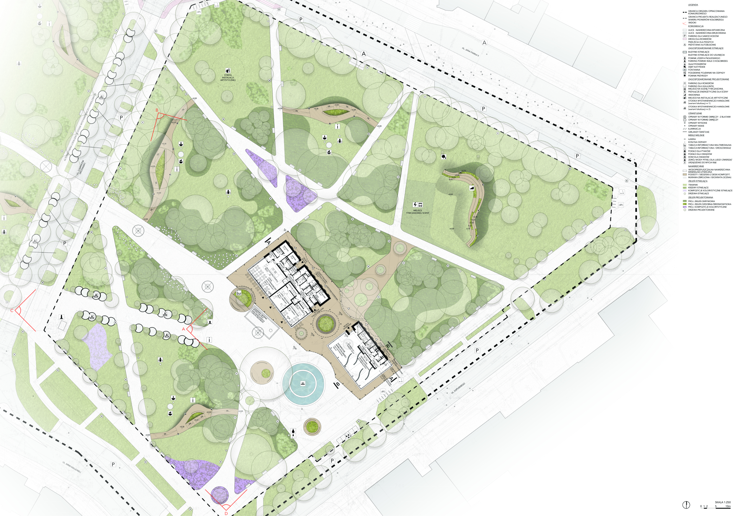 Założeniem projektu było zebranie programu, jaki Miasto planuje zaoferować użytkownikom, w jedną uporządkowaną formę. Projektowany budynek zdecydowano się wtopić w zieleń parkową, tak aby nie był on konkurencyjna dla otacząjącej, zwartej zabudowy. Celem było uporządkowanie ciągów parkowych i podkreślenie najważniejszych kierunków. Założono, że w projekcie najbardziej kluczowym jest szeroka aleja łącząca dwa główne place, z fontannami.