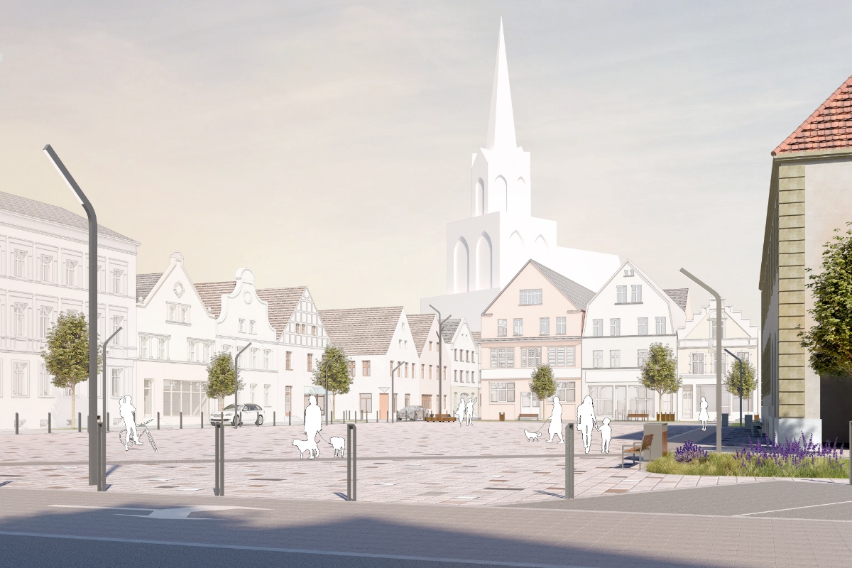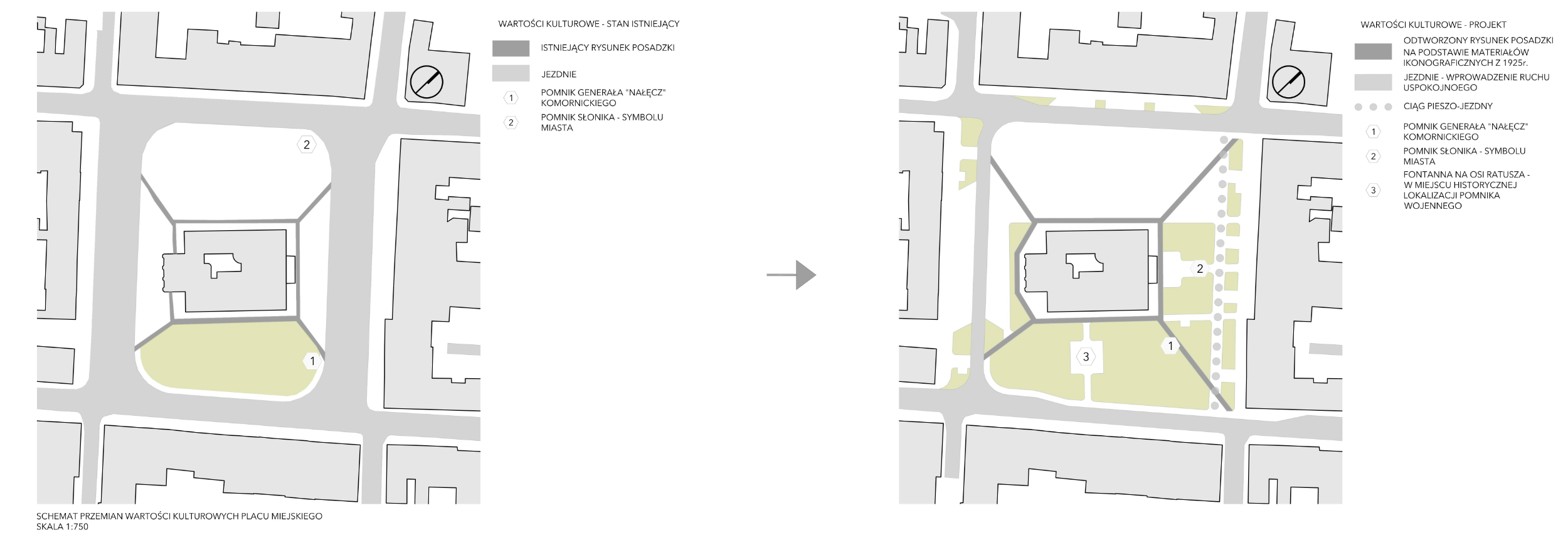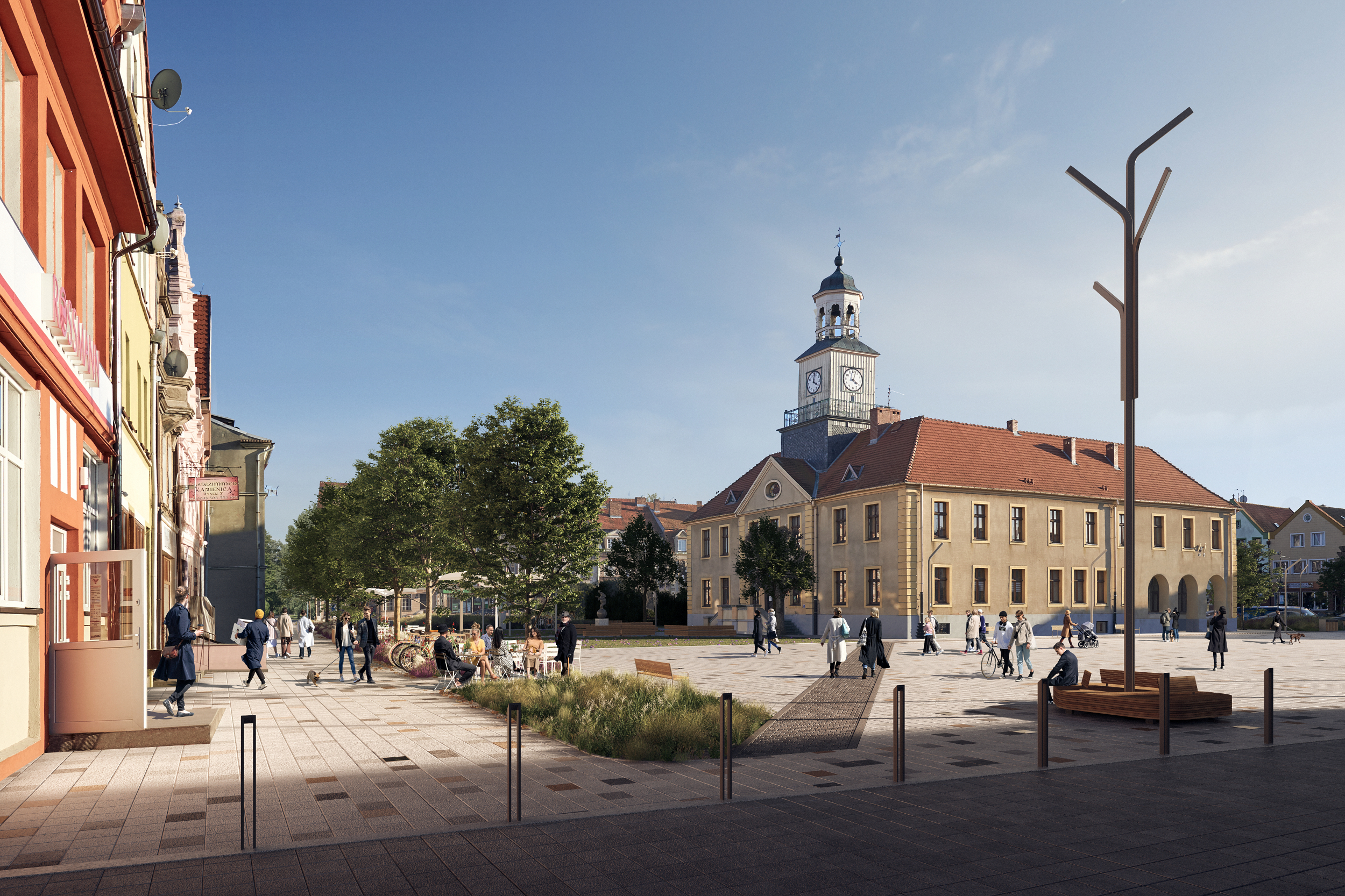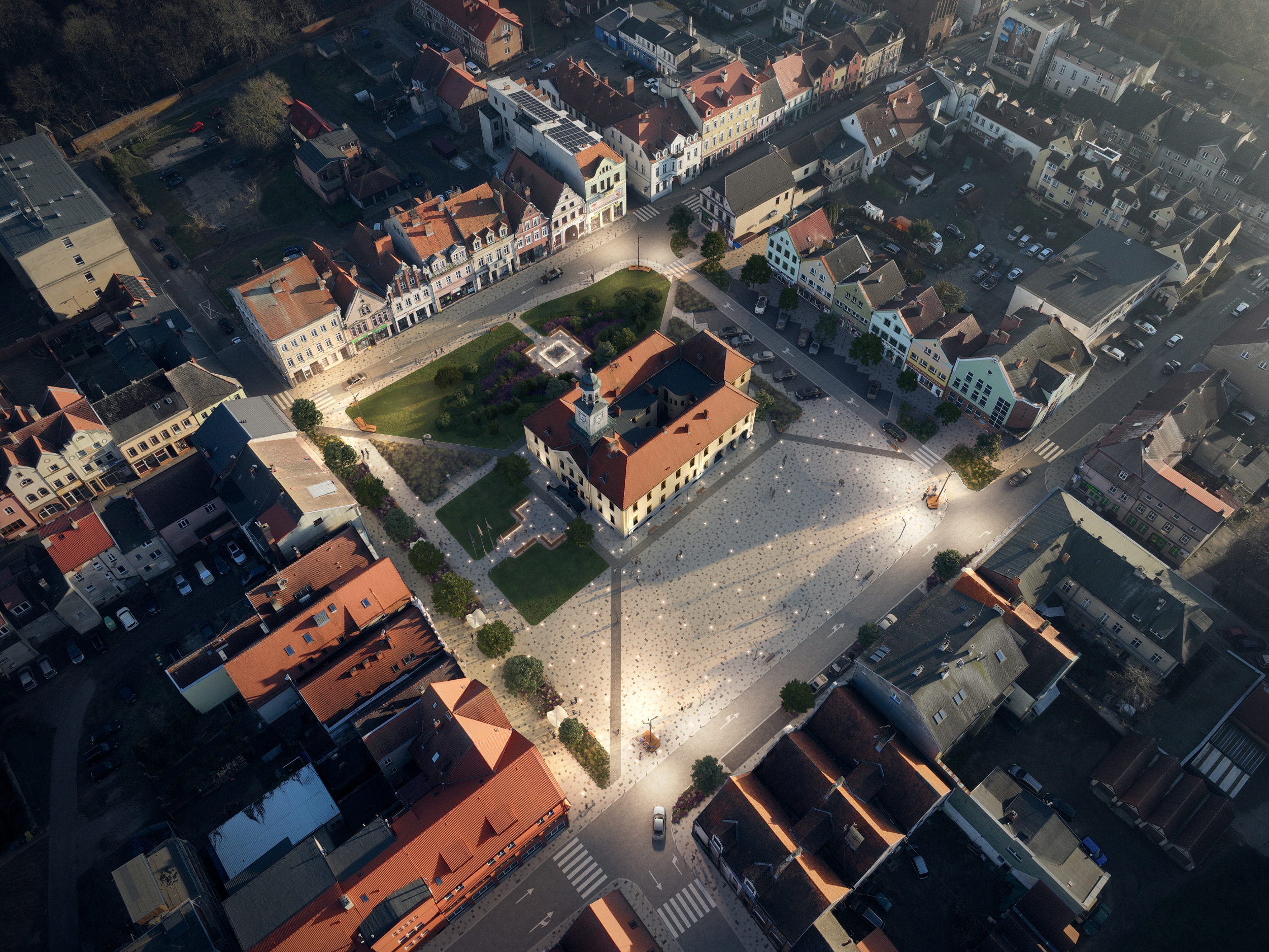 Rynek został tak ukształtowany, aby kwartały zieleni zajęły węższe przestrzenie wzdłuż krótszych boków Ratusza, co pozwoliło na otrzymanie jak największej formy głównego placu nie zaburzając przy tym jego funkcjonalności.