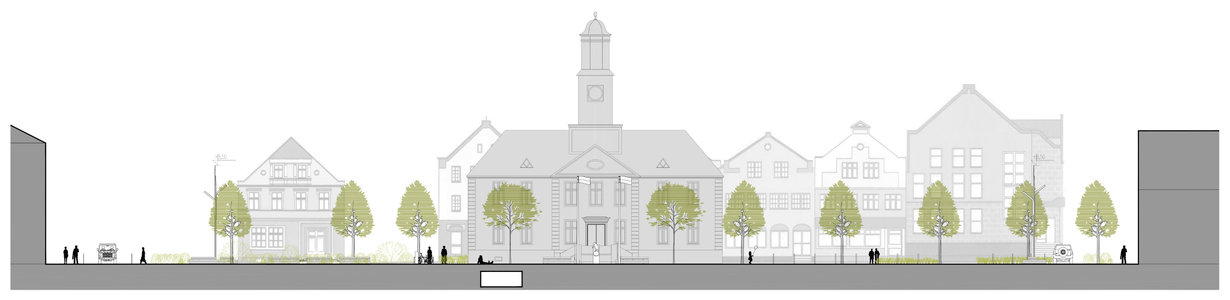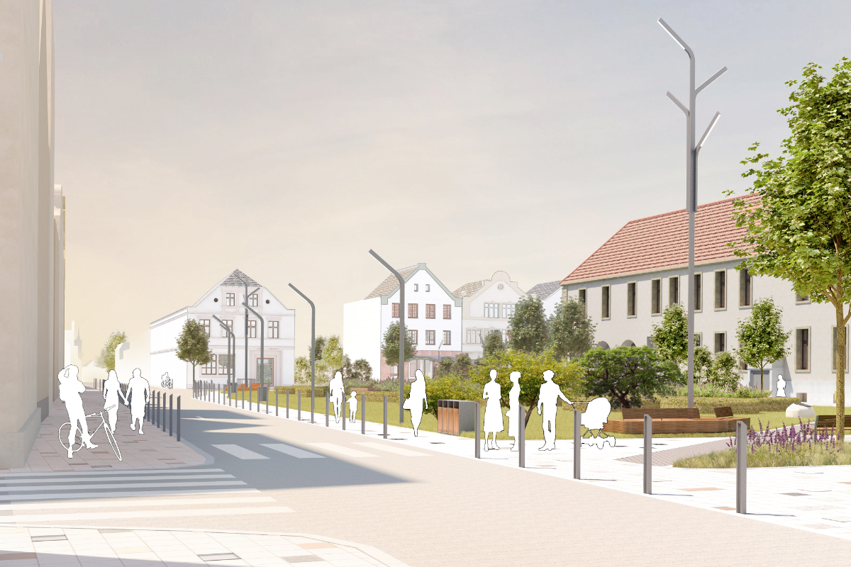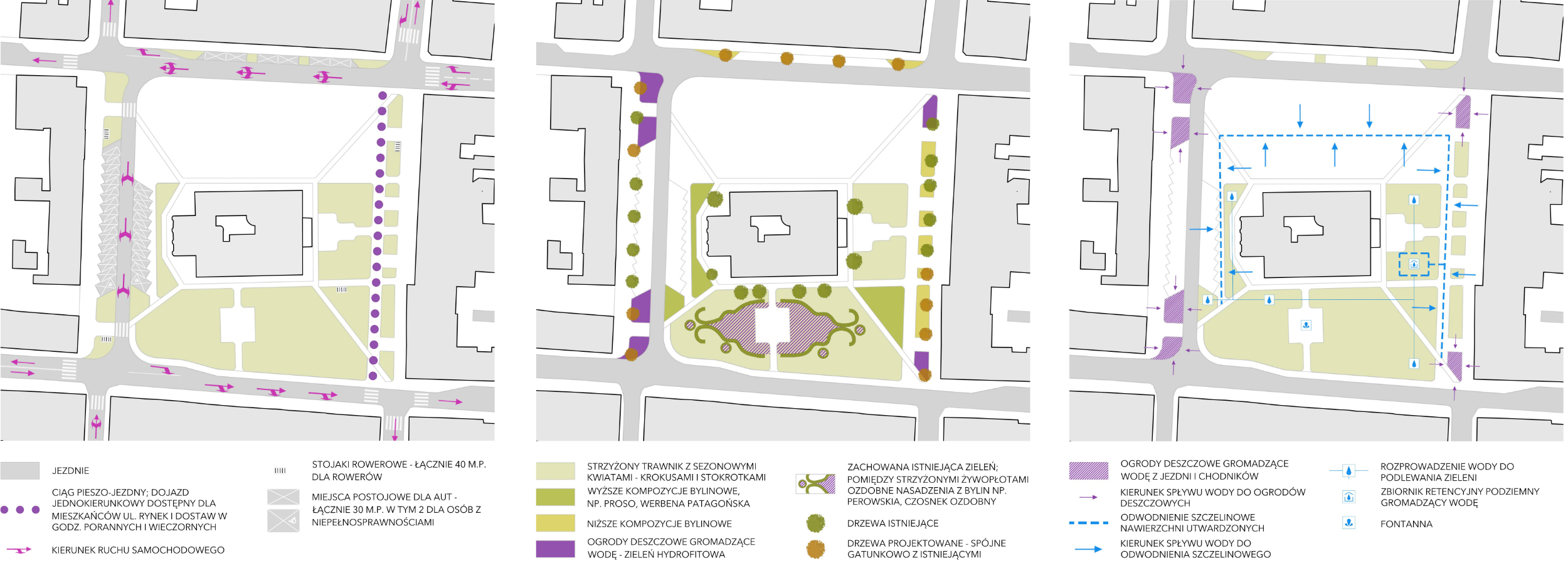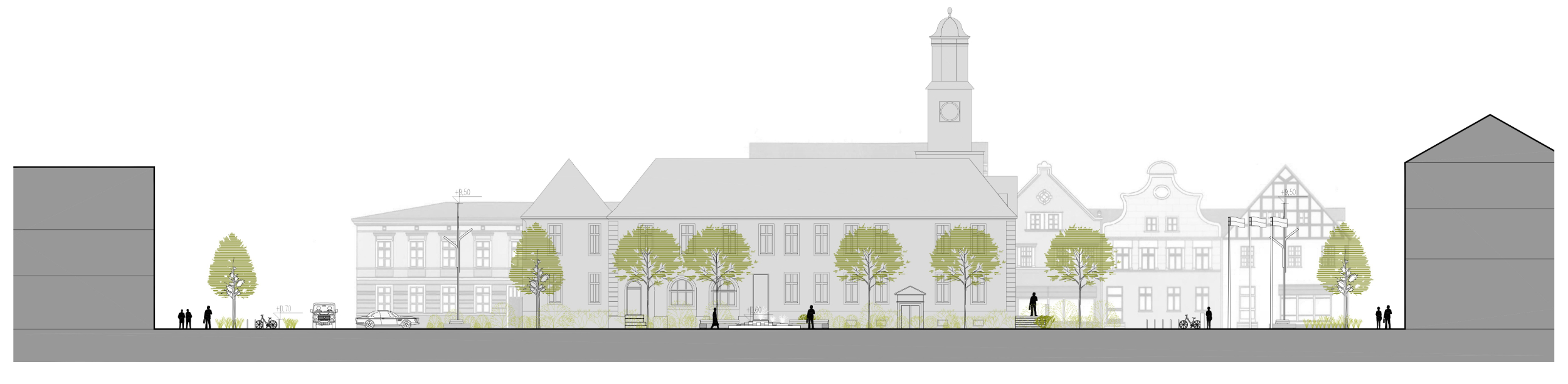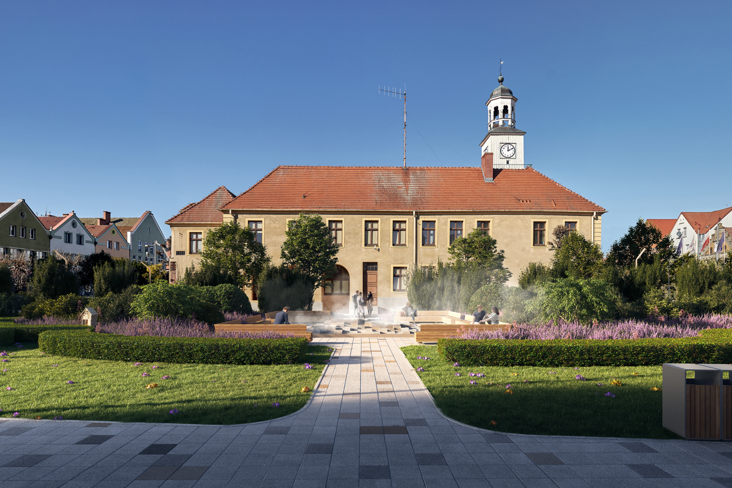 Obecny Rynek w Trzebiatowie jest wyjątkowy, bowiem od strony południowo – wschodniej jest zagospodarowany dużą ilością urządzonej zieleni. Intencją projektu jest jej zachowanie i maksymalne rozbudowanie, tak aby okalała Ratusz z trzech jego stron. Projekt dodatkowo przewiduje również ograniczenie ruchu aut dookoła całego Rynku, oddając więcej powierzchni ludziom – czy to w formie placu, czy trawników.